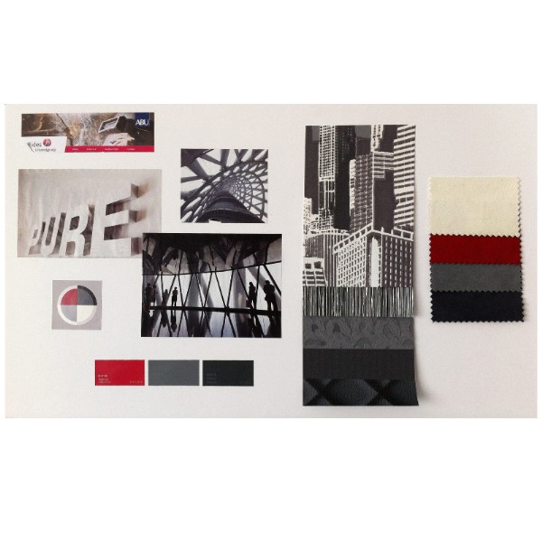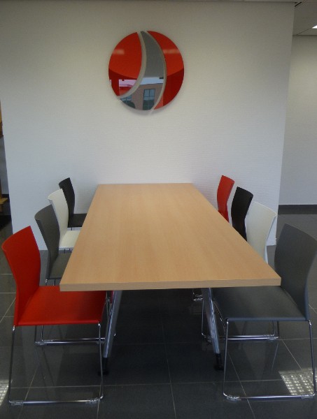 De kleuren van de huisstijl spelen in deze ruimte de hoofdrol. Rood,grijs en zwart