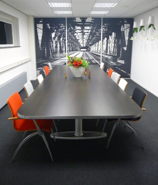 De kleuren van de huisstijl spelen in deze ruimte de hoofdrol. Rood,grijs en zwart
